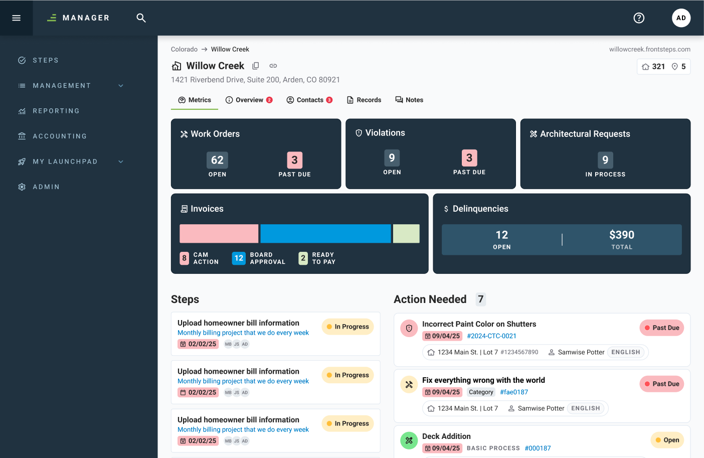 Search for any community and open the Community Detail Page to view fact sheets, billing items, CC&Rs, documents, and contact lists. See a clear snapshot of community health and address outstanding or time-sensitive needs with fewer clicks.